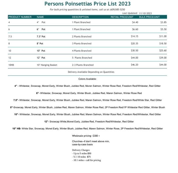 When it comes to our plant selection, we move with the seasons. We even sell pumpkins during the fall. Right now, Poinsettias are in season and we supply churches, restaurants, schools, fundraisers, events, and more! Our seasonal plants include: